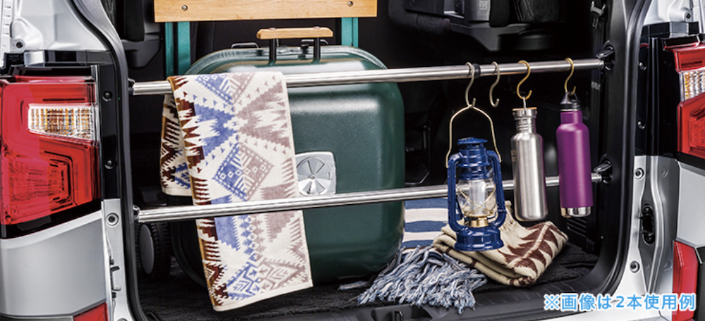 ラゲッジルーム内の仕切りや荷崩れ防止の他、S字フックやハンガーを使って小物や衣服の整理など、まさにマルチに活躍。